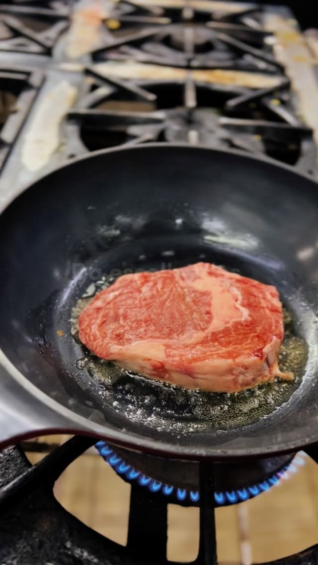 • Ancho coberto com Cebola Crispy, servido com Talharim ao Alho e Óleo, com Parmesão