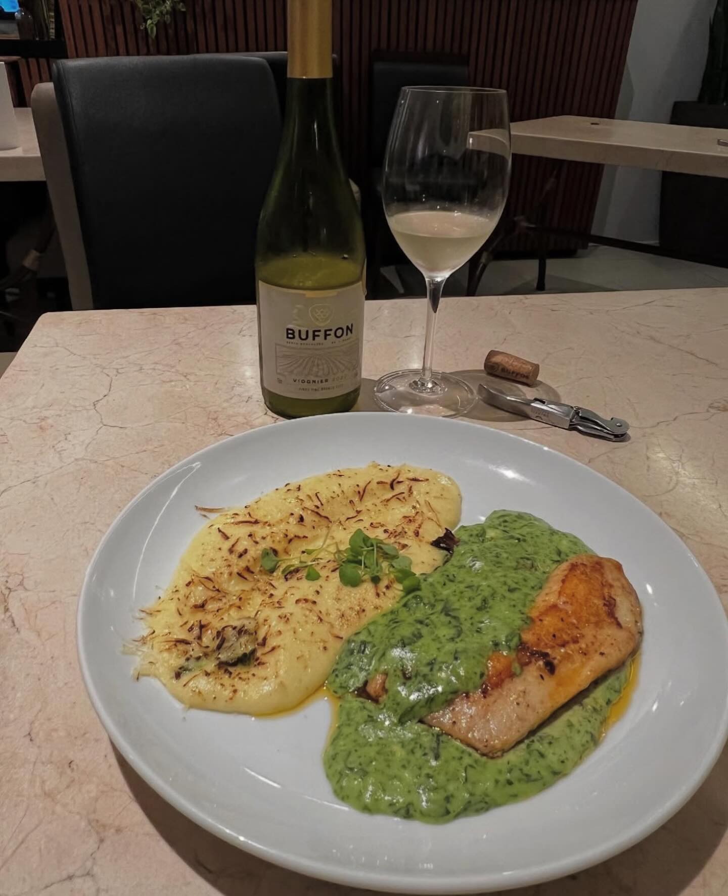 • St. Peter grelhado ao Creme de Espinafre, servido com Purê de Batatas gratinados com Parmesão