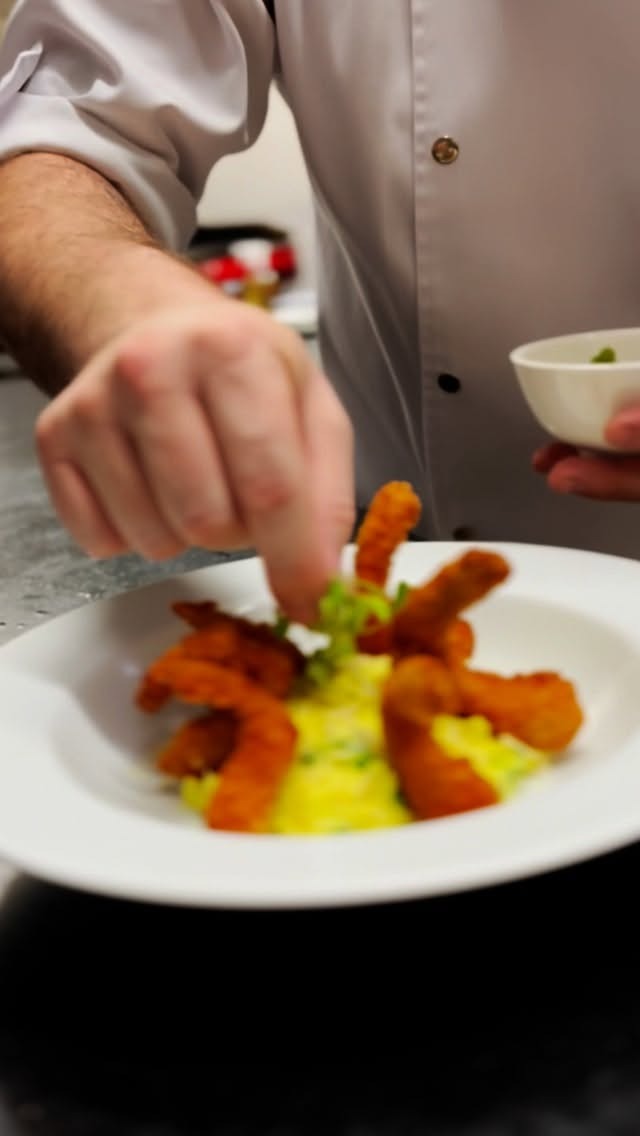 • Camarões crocantes, servidos com Arroz Cremoso de Alho-Poró, Açafrão da Terra e Parmesão