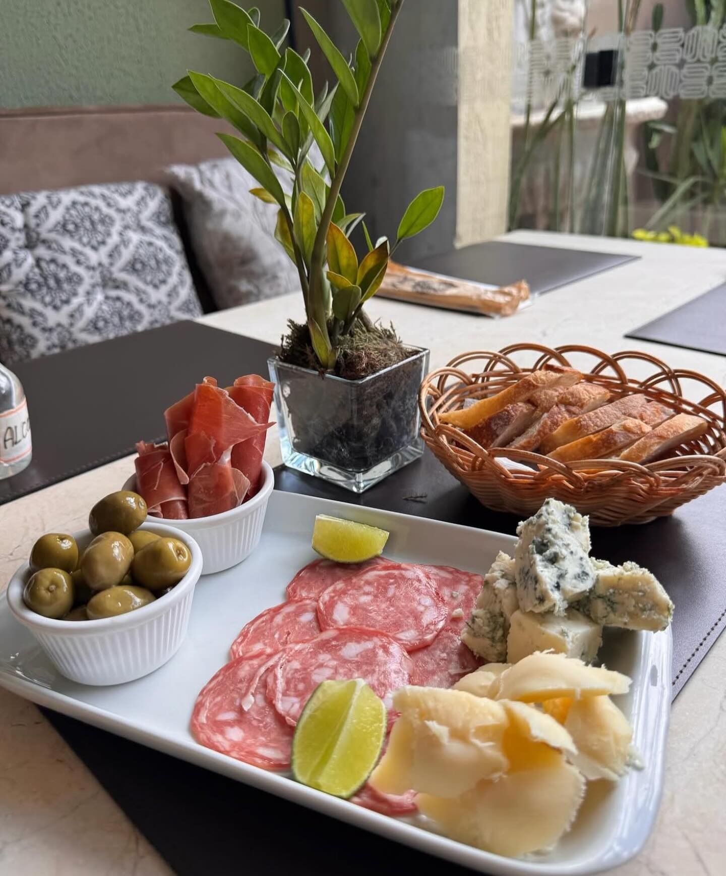 • Porção de Parmesão, Gorgonzola, Parma, Salame e Azeitonas Verdes servida com Pães